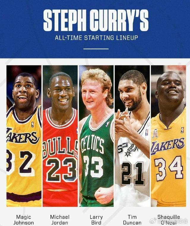 综上所述,库里给出的五人分别是控卫魔术师,分卫乔丹,小前锋伯德,大前锋邓肯,中锋奥尼尔。值得一提的是,库里声称他的心目中的历史最强阵容的前提必须是退役球员,因此詹姆斯、杜兰特等人也就无缘入围了。